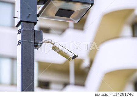 日本の横浜都市景観 街角の防犯カメラ。マンションの駐車場などを見守る目…=横浜市内