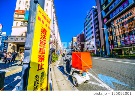 日本の東京都市景観 「バス停付近 横断歩道 違法駐車禁止…」。道路には、危険な放置バイク…=浅草