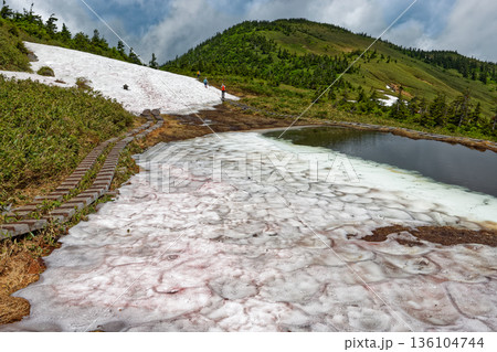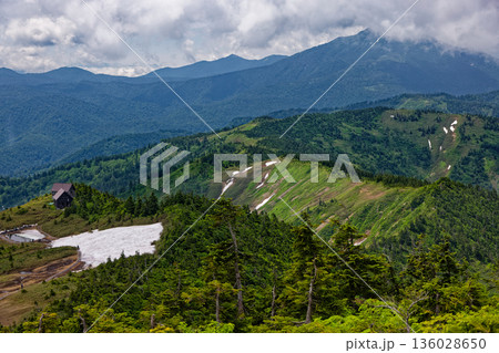 会津駒ヶ岳稜線の残雪と駒ノ大池・駒の小屋