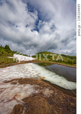 霧に煙る残雪の会津駒ヶ岳・駒ノ大池