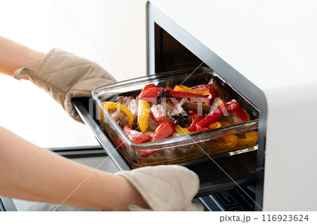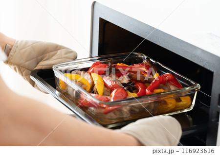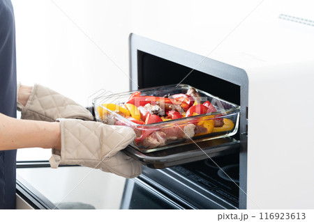 スペアリブと野菜のグリルをオーブンへ入れる手元