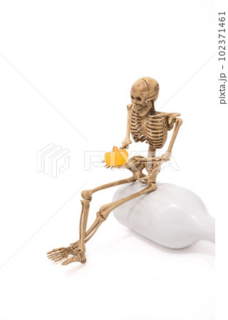 Skeleton sit on bottle is holding pumpkin isolated on white background, Halloween