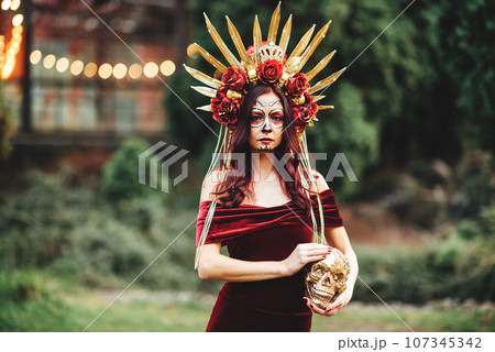 Young woman with painted skull on her face for Mexico's Day of the Dead. portrait of Calavera Catrina in red dress. Sugar skull makeup. Dia de los muertos. Day of The Dead. Halloween