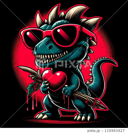SCARY dinasour carries a heart and wearing red sunglasses, illustration