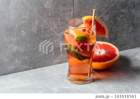 Mexican Tequila shot with salt and lime slice on grey table, closeup
