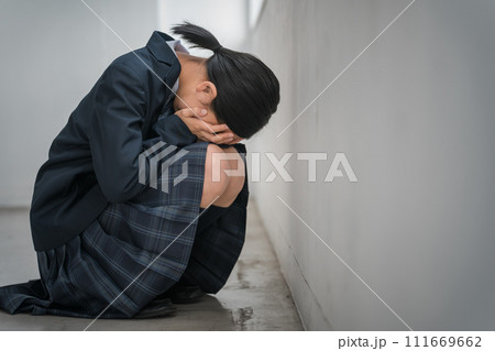 しゃがんで泣く高校生・中学生の女の子(いじめ・号泣・ストレス・パニック)