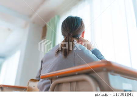 教室の窓際で泣く高校生・中学生・小学生の女の子(号泣・いじめ・孤独)