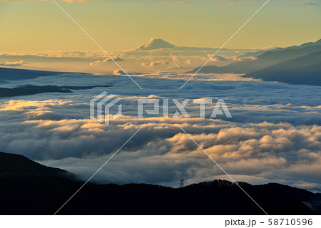 高ボッチ高原から望む 雲海に包まれる諏訪湖越の富士山