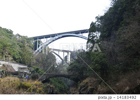 高千穂峡 五ヶ瀬川から神橋、高千穂大橋、神都高千穂大橋を見上げた風景 宮崎県西臼杵郡高千穂町