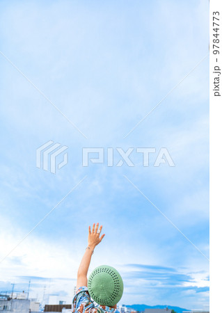 ストリートファッションの男性と空 後ろ姿 ファッション スケボー スポーツ ヒップホップ 夢 未来