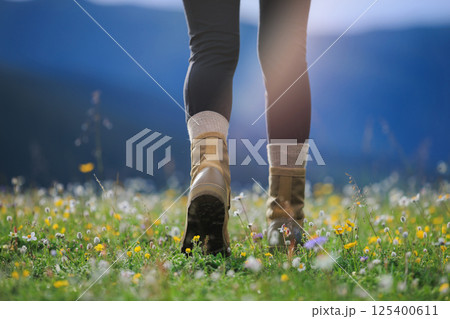 Hiker legs in leather boots walking on beautiful flowering grassland