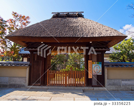 秋の京都 高台寺 春光院 紅葉に包まれた茅葺き屋根の門