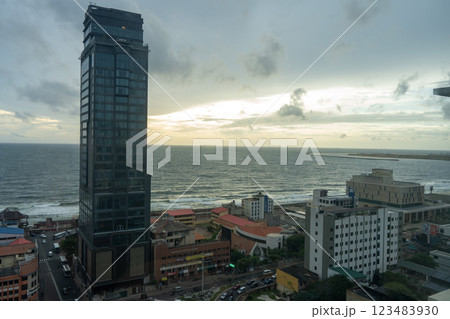 高層ビルと海と曇り空のサンセット