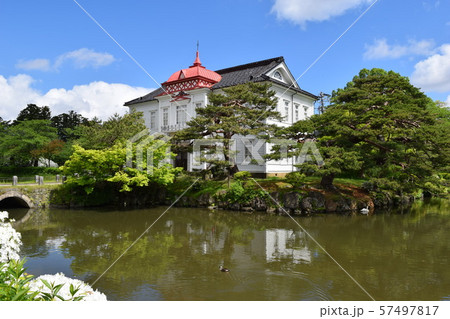 山形県鶴岡市鶴ケ岡城跡公園に建つ外堀の橋から見た大寶館 正面