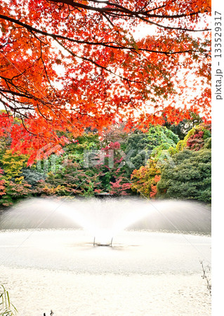 高岡古城公園の紅葉 噴水のある風景