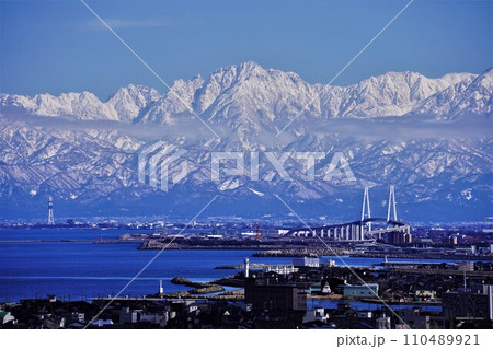 富山県高岡市気多神社の展望台より眺める立山連峰と日本海2