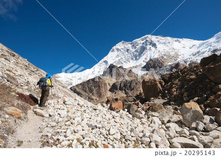 person yellow jacket stands mountain trail, gazing breathtaking view of snow capped peaks