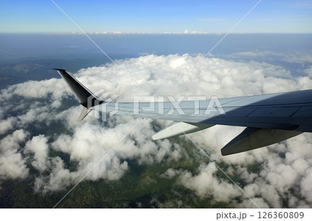 空の旅の始まり、飛行機の窓から見る青い空と広がる雲海の風景 AI画像