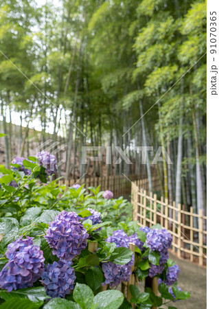 紫色のあじさいと竹林