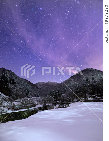 新潟県小千谷市 満天の星空と信濃川の雪景色(横構図)