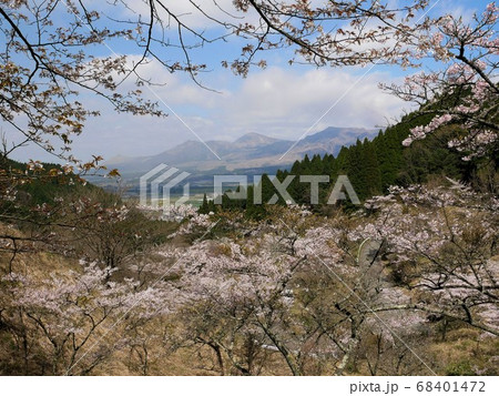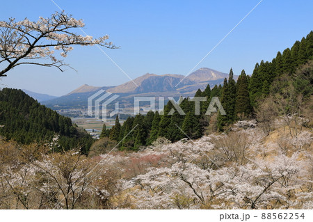 満開の桜が咲く高森峠からの阿蘇山の眺め