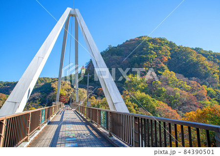 群馬県みどり市 朱色の高津戸橋と紅葉の山並み