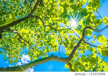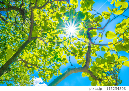 日本の植物風景 太陽光とハクモクレンの新緑。エコロジー、高潔な心、自然への愛などのイメージ…=横浜