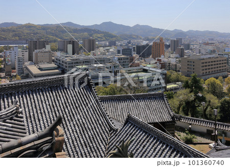 高知城天守閣から見た本丸御殿の屋根、高知県庁と高知市役所
