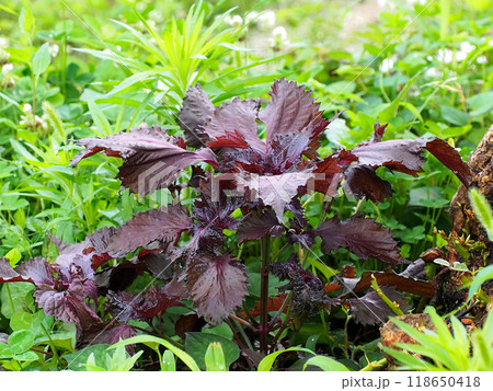 小さな紫色の花をつけたシソ(赤紫蘇)