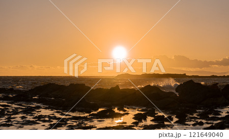 三浦市三崎町・高磯の岩礁に沈む夕日と潮だまりの美しい風景