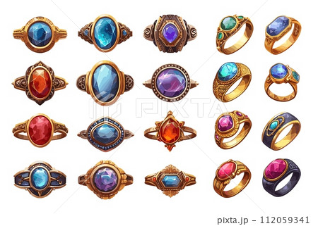 AI-generated content. Magic rings with gems set. Precious metal jewelry with diamond, emerald, ruby, sapphire, aquamarine, topaz, amethyst, opal, pearls. Game assets, UI, illustrations and design