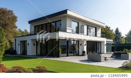 白い壁のおしゃれな新築一戸建て住宅 ワイド78 AI生成画像