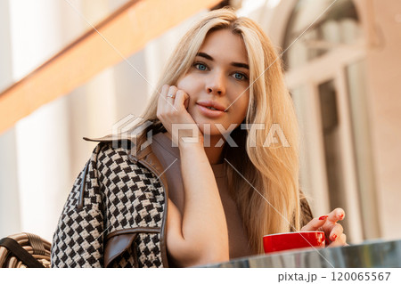 Woman Blonde Hair Cafe - A blonde woman with long hair sits at an outdoor cafe table, looking at the camera.