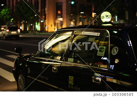 夜の銀座を行くタクシー