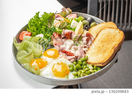 Breakfast plate with fried eggs, toast, ham, cheese, vegetables and fresh salad