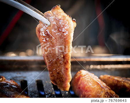 トングで持ち上げたジューシーな高級焼肉【豚トロ】