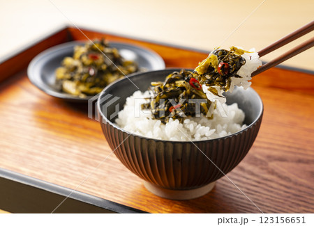 あつあつのご飯にのせた 高菜の漬物 ( めんたい高菜 ) つけもの 辛子高菜