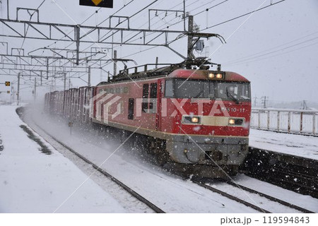 厳冬の湖西線 近江中庄駅を通過する 貨物列車