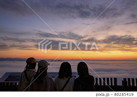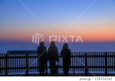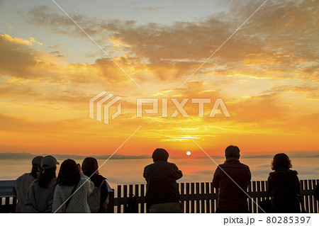 三次市高谷山展望台にて雲海に昇る朝陽を見つめる人