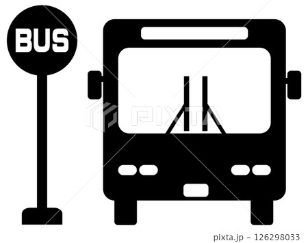 バスのシルエットアイコンとバス停留所のポールアイコン。バスターミナル。ベクター。