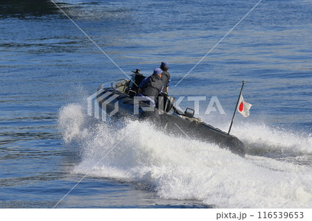 波しぶきを上げて走る舟艇 海上の警備艇