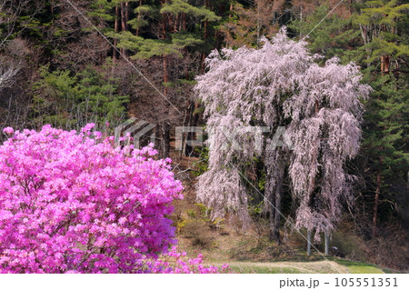 長野県伊那市高遠町勝間 勝間薬師堂そばの五郎山登山口の満開のシダレザクラとミツバツツジ