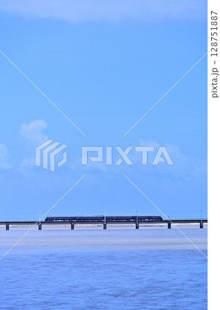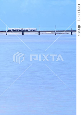 宮崎県高鍋駅付近に海にか架かる鉄橋と普通列車