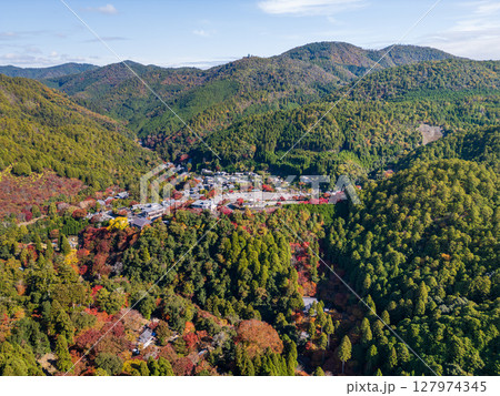 嵐山高雄パークウエイが走る高雄の空撮。眼下には神護寺と、紅葉に染まる山里が広がる。京都市右京区, 京