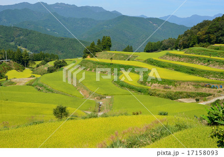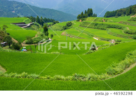 【旅行】晴れた青空の下の田んぼの風景 高知県の高須の棚田