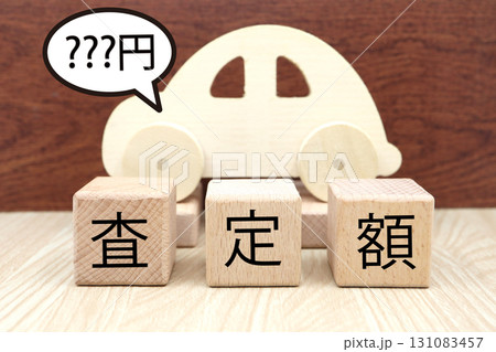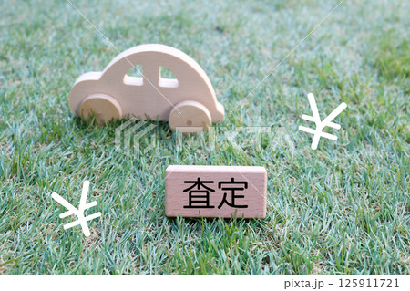 車の査定額上昇をイメージした木のブロックと円マーク。