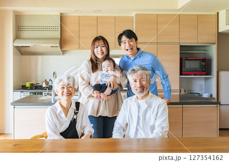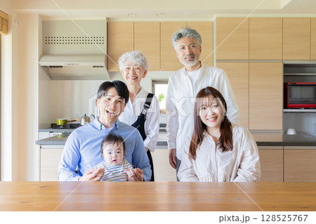 部屋で赤ちゃんを囲んで幸せそうな三世代家族の集合写真