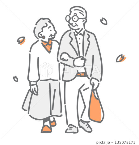 春のお散歩を楽しむシニア夫婦 シンプルでお洒落な線画イラスト