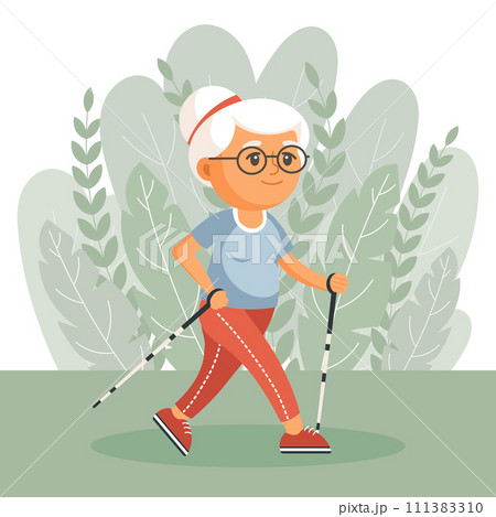 Happy old woman grandmother goes in for sports, yoga, walks. An elderly woman is exercising. Flat illustration in cartoon style, vector
