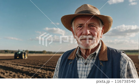 Confident elderly male farmer looking at camera while standing in a plowed field with a tractor.